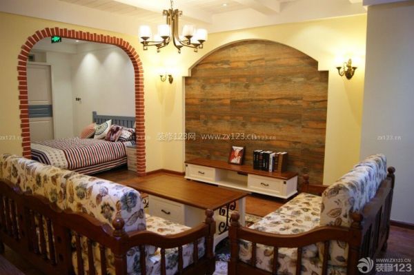 美式鄉村風格:濃烈的大自然韻味,外部效果簡潔誠實,凸顯了高雅的生活品味,適合樓距較低的樓層。此樣板房具有鄉村風格,完美體現在其仿木墻磚及褐色家具上,布藝上也帶有樹葉圖案,配上同款顏色的地毯。非常適合中年年齡層。