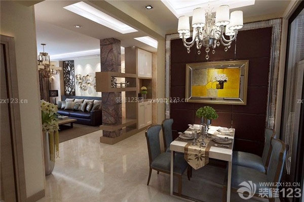 濃濃的紫咖色硬包,奢華中略帶典雅,鏡框線采用鑲鉆式,閃閃發(fā)光。用硬包演繹小資奢華,讓餐廳也極具情調(diào)。