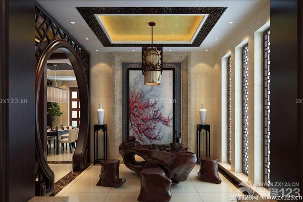 中式風格是比較自由的,裝飾品可以是綠色植物、布藝、裝飾畫,以及不同樣式的燈具等。這些裝飾品可以有多種風格,但空間中的主體裝飾物還是中國畫、宮燈和紫砂陶等傳統飾物。這些裝飾物數量不多,在空間中卻能起到畫龍點睛的作用。