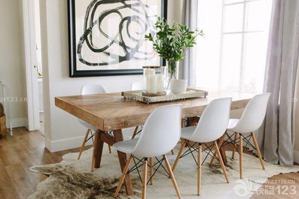 厚重的實木餐桌顯示出其獨特的魅力,伊姆斯椅與之十分相搭。簡單卻又厚重的餐桌既擁有原木的自然親切又具備了沉淀韻味,背景墻裝飾著抽象的藝術(shù)掛畫,讓簡約空間也擁有觀賞感。