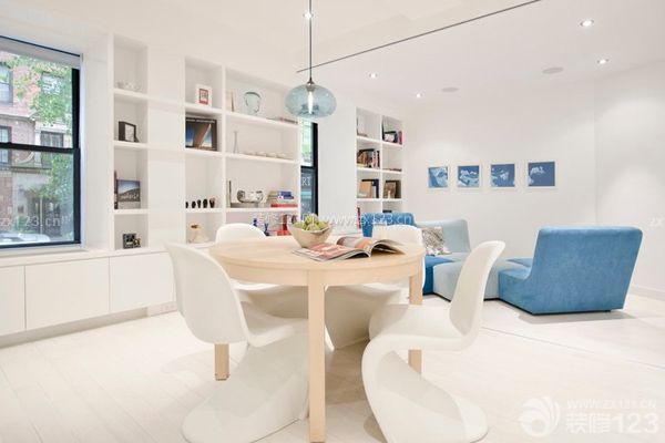 看到這樣的餐廳設(shè)計,不知道大家是不是和小編一樣被深深的吸引了呢,非常有個性的藍色調(diào)設(shè)計讓這個餐廳散發(fā)出一種沉靜的美感。光滑的木質(zhì)桌面處理讓原木材質(zhì)具備了現(xiàn)代之美,澄凈的藍色系背景墻與餐桌的椅面相呼應(yīng),給小戶型層次之美。