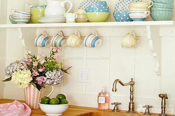 清透的白色小廚房設計制造出簡單的生活氣氛,彩色的餐具裝扮了家庭廚房背景墻,狹小的廚房空間擁有溫暖的生活氣氛,家庭廚房裝修得很緊湊,不浪費任何一個空間,合理而巧妙的設計把廚房打造成童話般的風格,新鮮的花朵點綴實木的櫥柜面臺,幸福的生活環境讓人感到滿足。