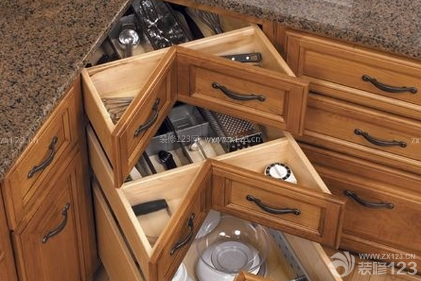 在廚房拐角處安置一個(gè)三角形的吊柜,將所有上部空間全部利用起來。