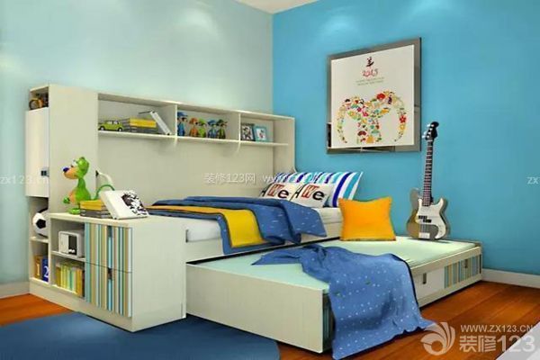 2、整個青少年房空間以黃色調為主,活潑溫馨。適合幼兒園至小學時期的小男生居住。上床下書桌搭配書柜組合的設計,不僅節省空間,且實用性強,房間雖小,卻功能齊全,收納功能強大,飄窗處的設計可以作為娛樂游玩區,適合小朋友聚會聊天。