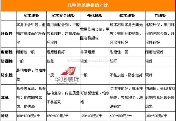 從上表的幾種常見地板的對比中,可以看出不同種類的地板的性能有所差別:實木地板較環(huán)保;實木復(fù)合地板穩(wěn)定性好;強化復(fù)合地板非常耐磨;軟木地板柔軟,靜音效果好;竹地板外觀清新。