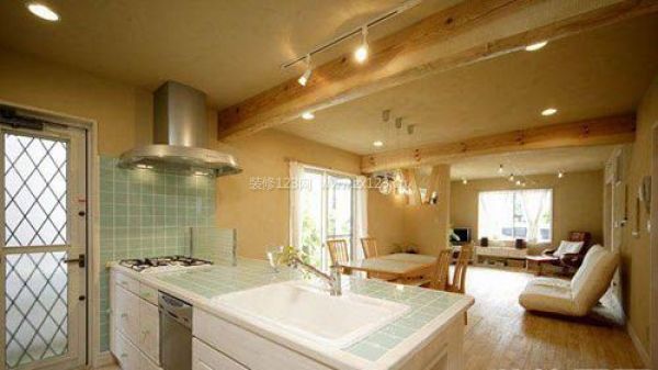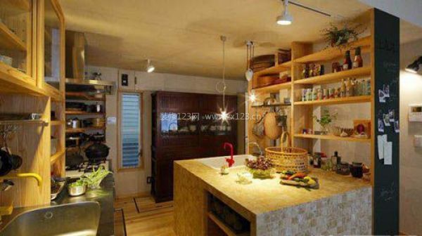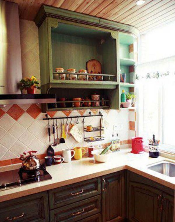 編輯點評:用復古式小瓷磚砌成的工作臺,面積寬大,可以滿足洗涮、準備等工作。開放式木架,透露出暖暖的原木色彩,方面收納和拿取。