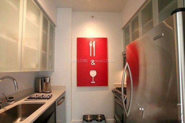 編輯點評:只用銀色和白色裝修的空間,放上紅色的代表廚房的圖畫,讓人增強食欲,精神振奮。而且一片樸素的顏色中,突然出現一塊紅色的色塊,讓人的視線一下子集中到一點,給人以視覺的沖擊。