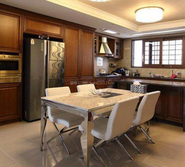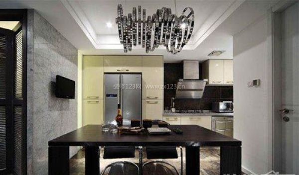 編輯點評:餐廚在同一空間,大理石紋理墻面與同樣紋理的地面連接在一起,讓空間更加開闊。整體式廚房囊括了所有現代化電器,餐廳的吊燈更增加了空間的現代感。