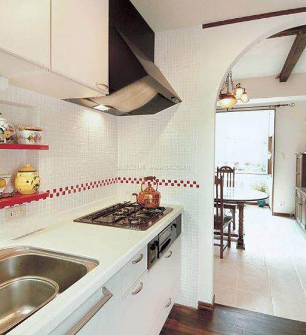 編輯點評:廚房就在飯廳的另一側。采用明亮的白色做主顏色,墻上貼上紅色的小方磚,簡潔大方而又不顯單調。