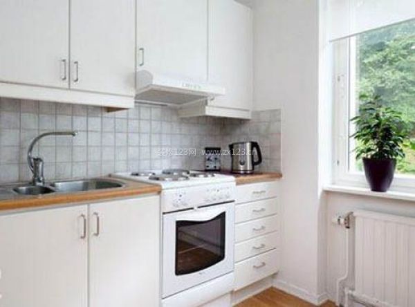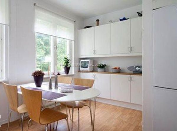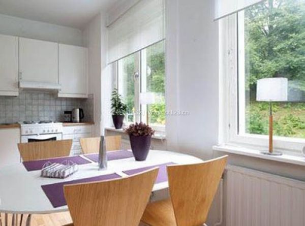 結構方正的廚房,兩邊“一”字型的整體廚柜將空間最大化利用,中央增加一個簡單的餐臺將中間部分巧妙靈活地使用起來。白色的廚房色調稍顯單一,不過紫色餐巾布的小小點綴讓整個廚房更加富于動感。