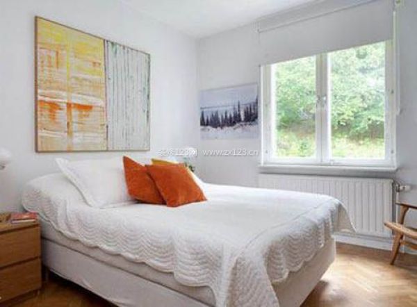 臥室整體百搭的白色基調,搭配色彩醒目的布藝靠包,以及相同色系的裝飾畫,讓整個空間看起來清新流暢。棉質的流水紋床品帶來細膩、柔和的觸感。自然、輕巧的裝飾不會增加任何視覺與心情上的負擔。