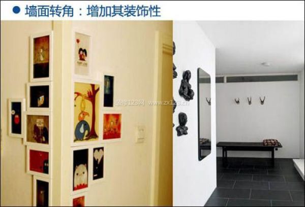 設(shè)計(jì)技巧:墻面轉(zhuǎn)角利用相片墻的設(shè)計(jì)形式對(duì)其裝飾,通過相框的點(diǎn)綴讓原本黯然失色的墻面帶有與眾不同的活力與新鮮。也可以通過鏡子、雕刻的藝術(shù)畫對(duì)其修飾,特別是對(duì)小空間而言,它更能在空間上得到一種延生感。