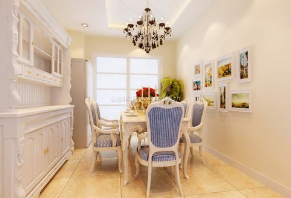 設(shè)計亮點:米白色的餐廳背景墻制造出很多溫馨的氣氛,與純潔的白色相搭配,亮白色的餐桌,歐式座椅,營造出簡約不簡單的視覺效果。同時餐廳背景墻通過框畫的修飾,增強其整體的豐富性,給進餐氣氛增加更多情趣。
