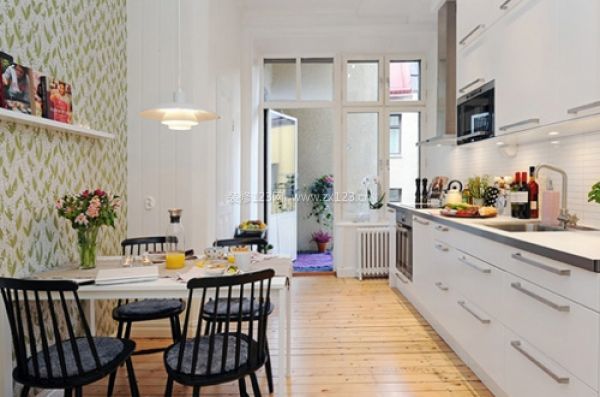 時尚的廚房的廈門使得它感覺特別寬敞。鑲板門和異型廚房碗柜形成鮮明對比的白色時尚的廚房。上方和下方用白色光滑門柜提供大量的存儲。另一邊墻壁用很好的壁紙,是4-6人舒適的用餐區,顯得不會太過于蒼白。最贊的是廚房也有一個陽臺,每天都能享受著大量的自然光線。