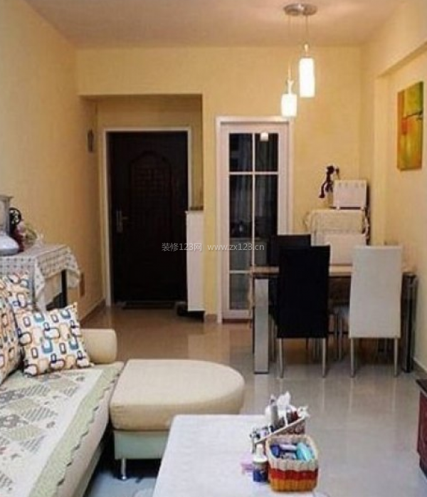 這個客廳的面積十分狹長,從這個角度,靠近大門的地方被用墻圍起來一部分作為50平米小戶型的廚房,廚房門出來不遠處設有客廳。桌布沙發套和茶幾布都是主人親自選的,樸素的花色增添了生動的旋律。