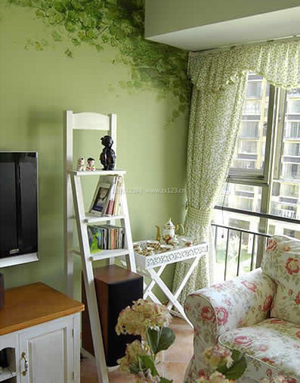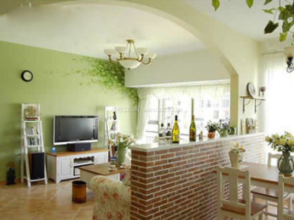 電視背景墻采用綠色粉刷。角落手繪長春藤葉子,翠綠的顏色不但能放松人的眼球,還產生仿佛家居在田田藤葉之中。半人高的隔斷,開放的空間產生空曠的視覺感。拱形的墻壁隔斷增加了客廳餐廳一體空間的連同視覺高點。
