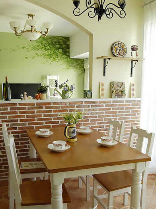 客廳餐廳一體空間的吊燈都采用富于線條變化的歐式吊燈。餐廳和客廳的間隔還能夠防止酒品和植物盆栽。仿造農村后土切成的隔斷才充滿田園風味。