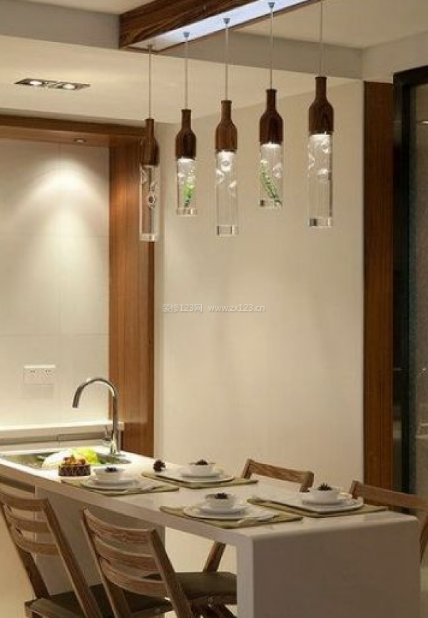 餐廳采用吧臺的設(shè)計方式顯得既時尚又浪漫。燈光采用水晶裝,內(nèi)嵌有綠色植物葉片,讓餐廳空間適當(dāng)加入了自然情切的感受。讓日式風(fēng)格和現(xiàn)代簡約風(fēng)格的混搭不出不在。