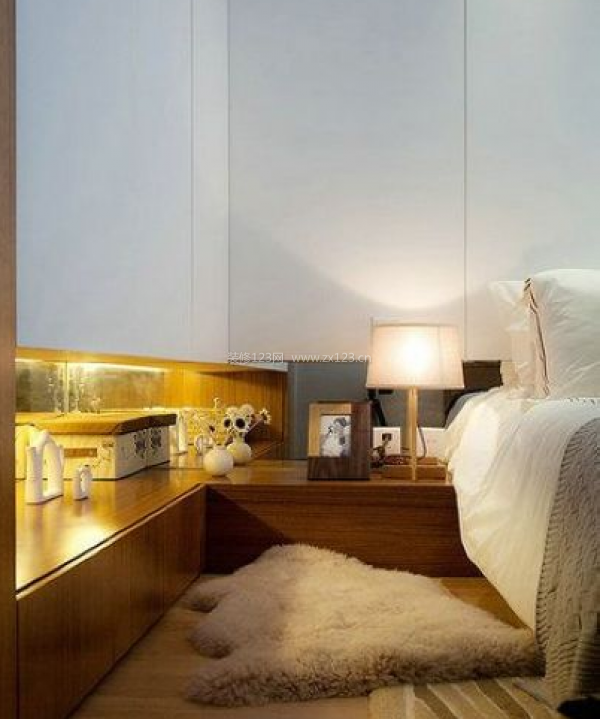 干凈整潔的白色加上原木風(fēng)味的木材,恰當(dāng)?shù)膶⒑啙嵑腿帐斤L(fēng)格融為一體。床頭邊設(shè)計采用一段懸空的壁柜夾層,不但可以收納,還可以擺些裝飾等,在表現(xiàn)出創(chuàng)意的同時,還大大增加了臥室的容物能力。