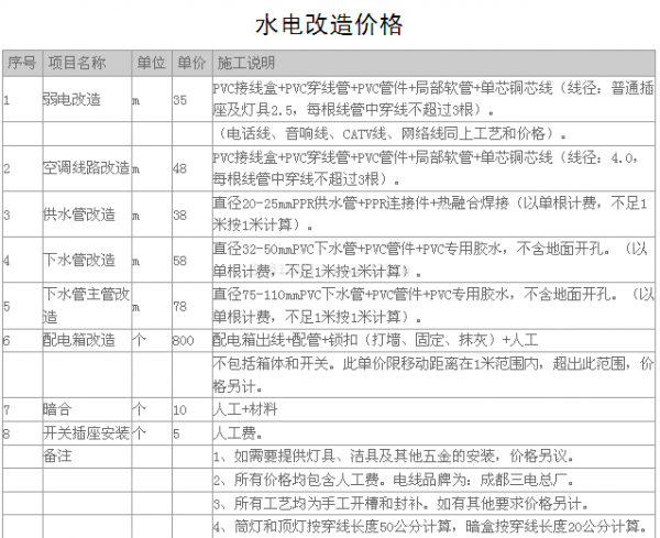 這份水電裝修報價詳細的給出了水電裝修中的項目,和所需要使用的材料及它們的價格。而且施工說明也很詳細,可以作為業主朋友的參照。更多有關成都裝修報價的介紹歡迎進入成都裝修網站進行詳細了解。