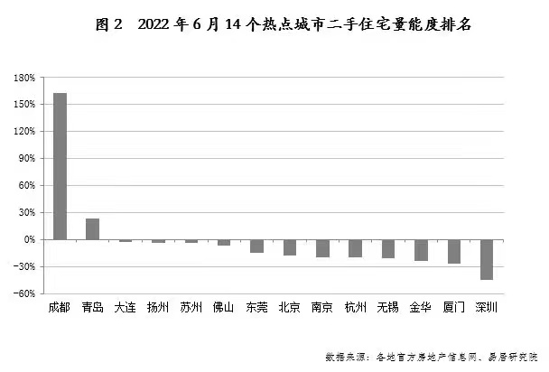 2022年6月,成都以357.3%的月度同比增速、256.5%的1-6月同比增速,在易居全國14個重點監(jiān)控城市“一騎絕塵”的同時,其二手住宅成交量能度高達(dá)162.5%,創(chuàng)下2013年4月以來的最高記錄。