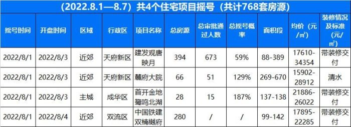 據相關數據顯示,8月1日~7日,成都共有4個住宅項目搖號,共計768套房源,其中,主城1個項目28套,近郊3個項目740套。