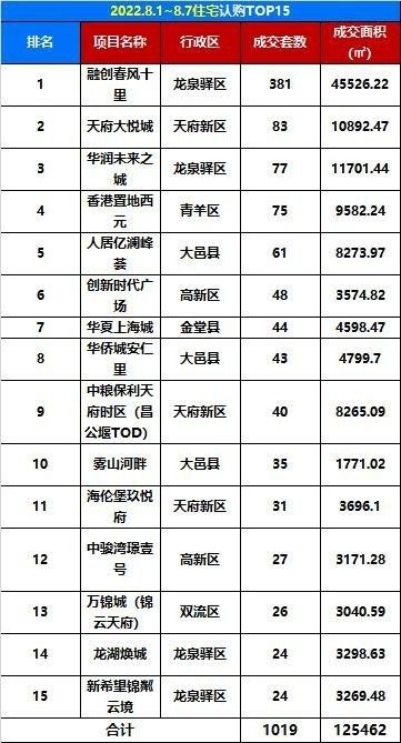 其次,上周(8.1~8.7)成都住宅TOP15銷售共計1019套,其中包括融創春風十里、天府大悅城、華潤未來之城等熱門樓盤。