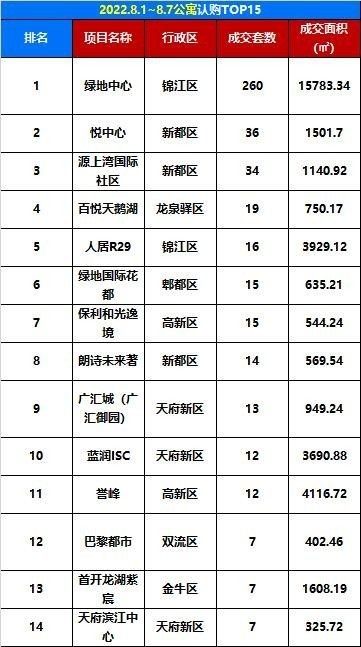 最后,上周(8.1~8.7)成都公寓TOP15銷售共計1019套,包括綠地中心成交銷量為260套,成交面積15783.34平方米、領地悅中心公寓成交銷量為260套,成交面積1501.7平方米、源上灣國際社區成交銷量為34套,成交面積1140.92平方米等等,均在8月樓市里,都取得不錯的“成績單”。