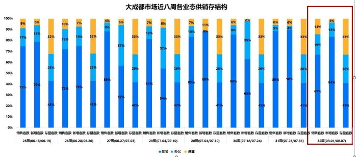 如圖所述,成都近八周(6.138.7)住宅銷售結構占比下降22%,公寓銷售結構占比上漲13%,商業銷售結構占比上漲;公寓供應結構上漲,住宅、商業供應結構下滑,各業態存量結構維穩。