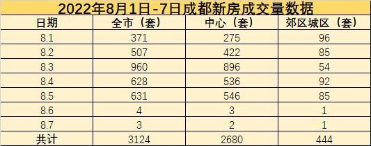據數據顯示,2022年8月1日7日,成都新房成交量共計為3124套,中心區域為2680套,郊區城區為444套。