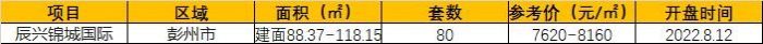 據(jù)數(shù)據(jù)統(tǒng)計(jì)來(lái)看,成都8月8日~14日,遠(yuǎn)郊區(qū)域共計(jì)有1個(gè)項(xiàng)目開(kāi)盤(pán),共計(jì)80套房源,為彭州市 辰興錦城國(guó)際,具體情況如下: