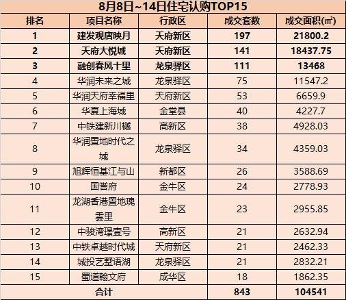 成都上周(8.8.~8.14)新房TOP15銷售共計843套 ,其中主城5個 ,近郊9個 ,遠郊1個。