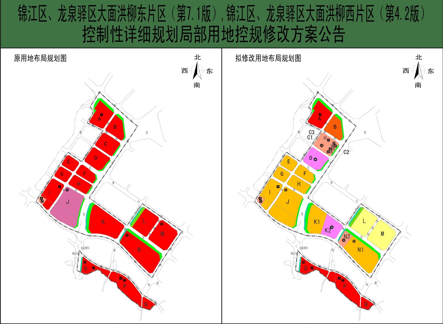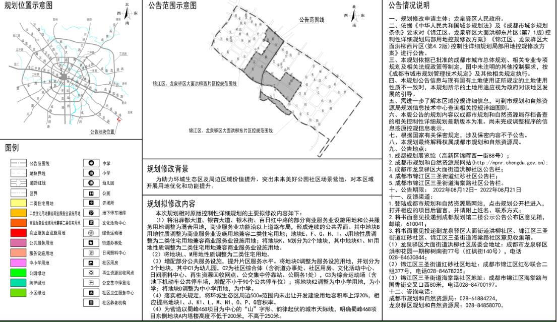這份公告期限為2022年8月12日至2022年8月21日的控規修改方案公告,涉及錦江區、龍泉驛區大面洪柳東片區和大面洪柳西片區,這個片區正是成都東在建的成都第一高的地表性建筑綠地468的周邊。這次規劃修改的內容,對這個片區來說可以說是“天翻地覆”。原有的以商務和商業用地為主的區域,變成以住宅為主,僅保留了一小片商業用地。