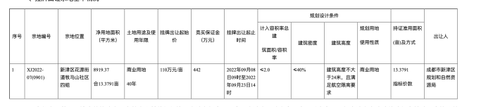 成都新津出讓1宗國有建設用地使用權,宗地位置:花源街道牧馬山社區四組,編號:XJ2022-07(0901) 商業用地 40年
