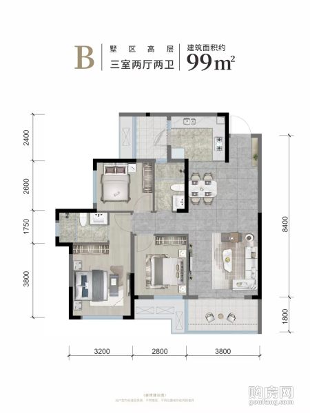 B戶型(3室2廳,99平,南北)
